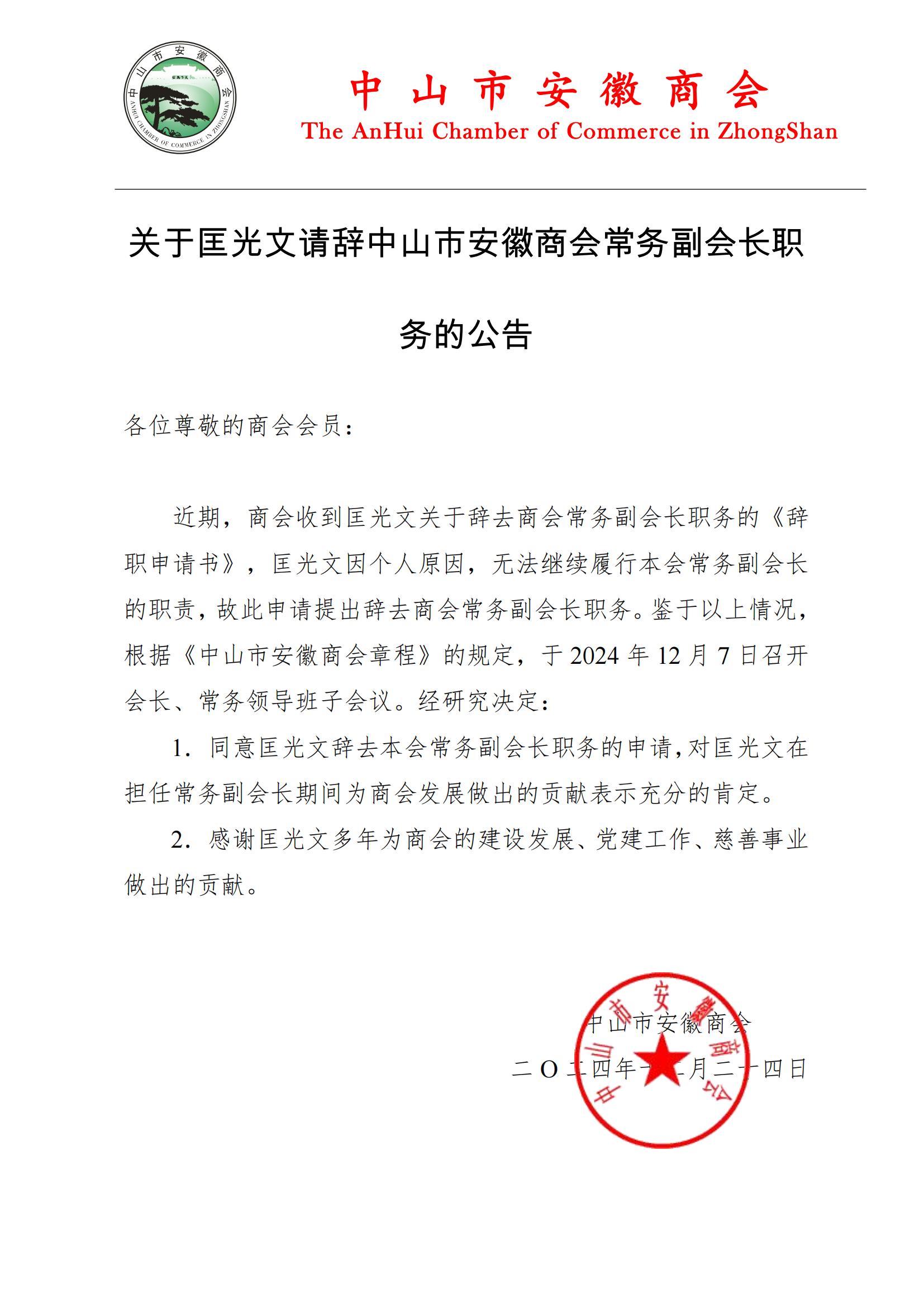 关于匡光文请辞伟德官网电脑版常务副会长职务的公告