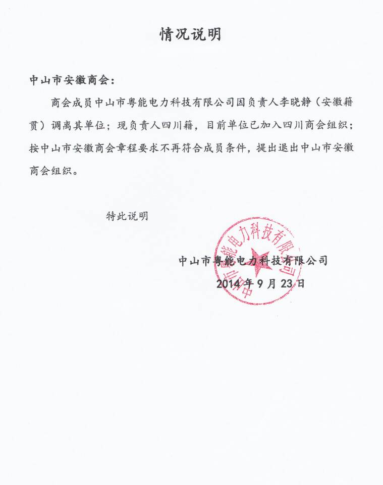 关于副会长单位中山市粤能电力科技有限公司退会公告