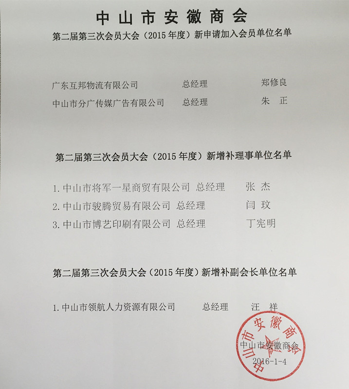 中 山 市 安 徽 商 会第二届第三次会员大会(2015年度)新申请加入会员、理事、副会长单位名单公示