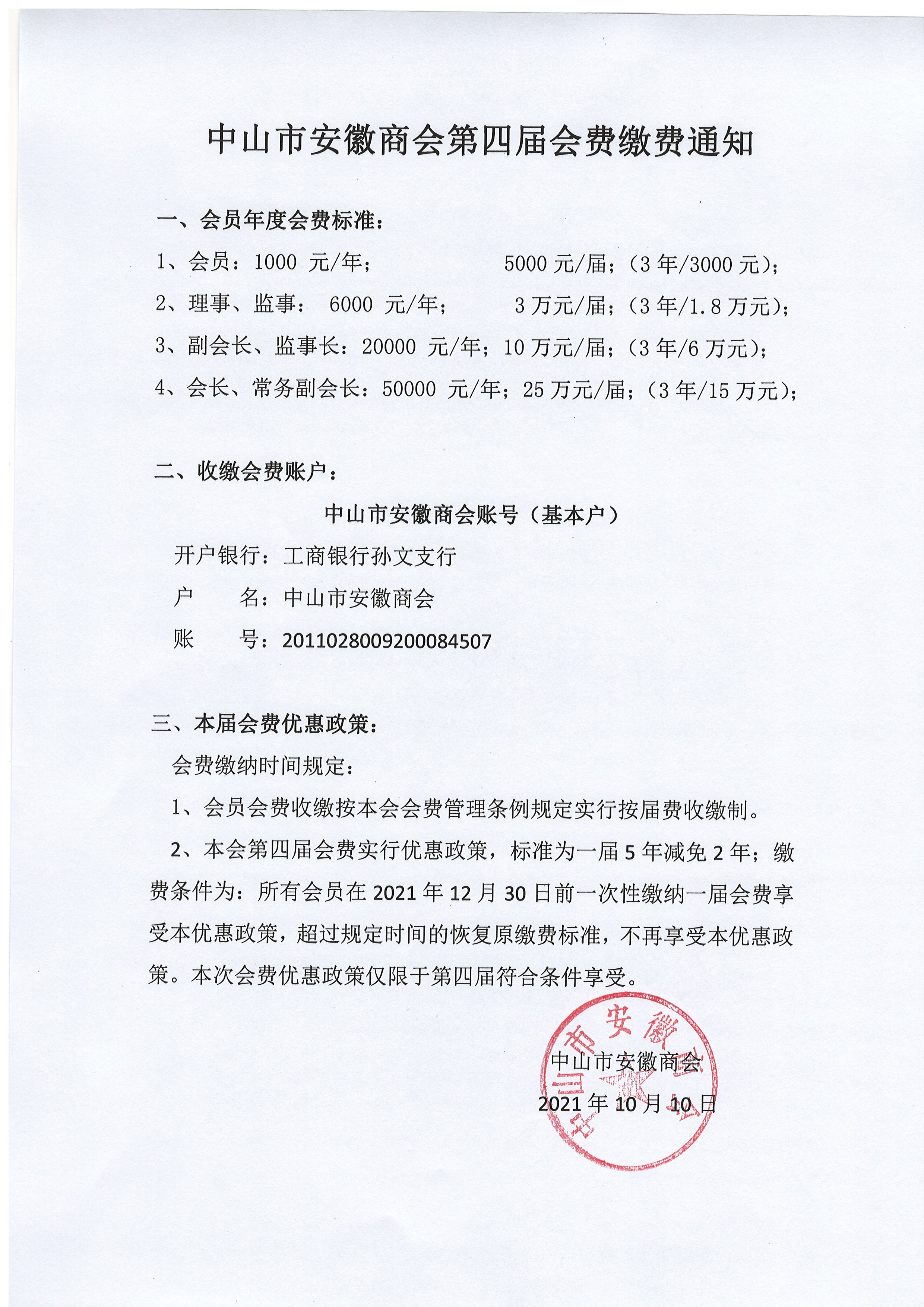 【商会公告】伟德官网电脑版第四届会费缴费通知