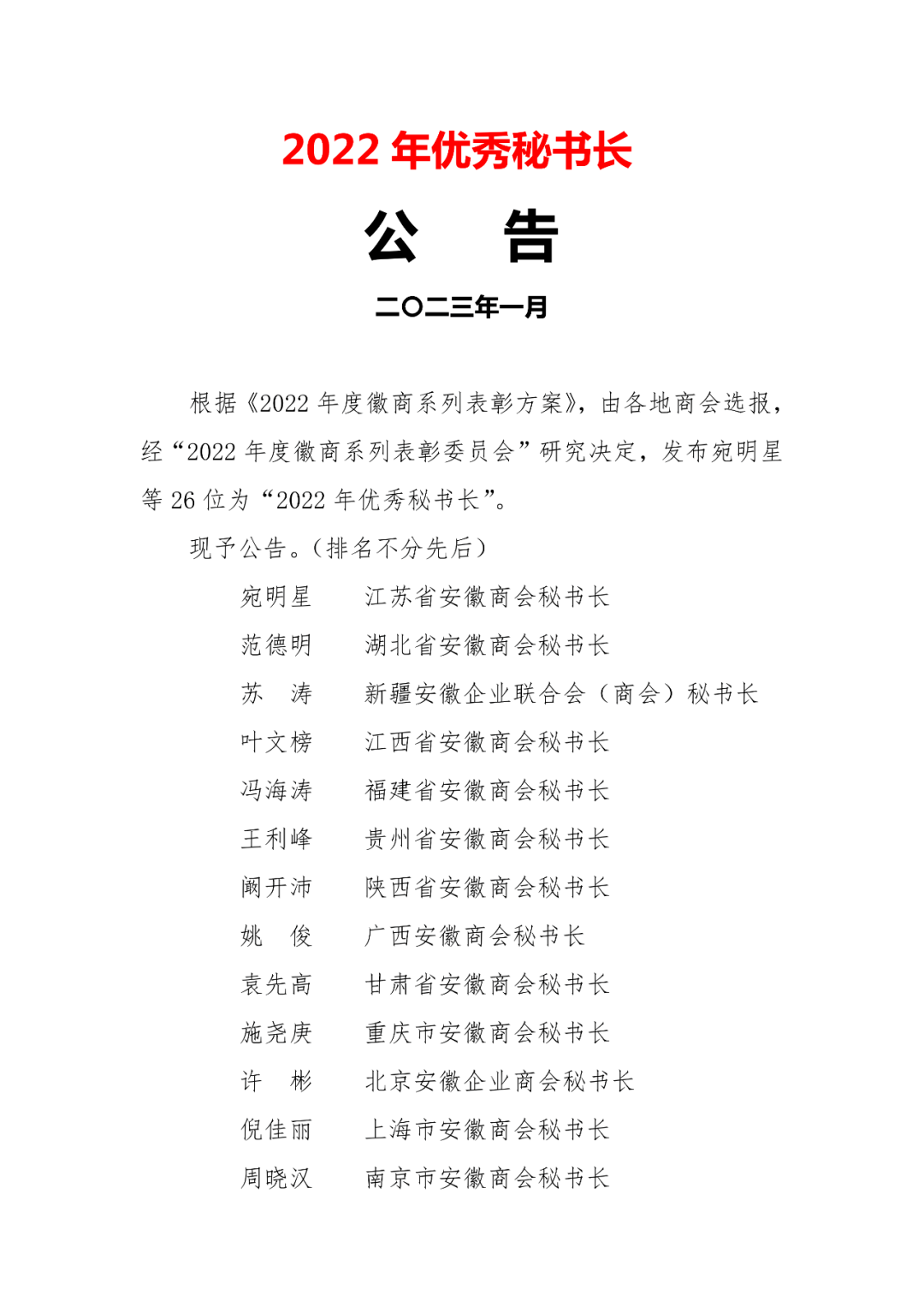 由安徽国际徽商交流协会主办的年度徽商系列评选——“2022国际徽商系列表彰”榜单现正式发布。在“2022年优秀秘书长”、“2022年度中华百名优秀徽商”榜单中,恭喜秘书长孙长征获得“2022年优秀秘书长”荣誉称号;恭喜伟德官网电脑版党支部书记、常务副会长李进、副会长阚建波获得“2022年度中华百名优秀徽商”荣誉称号。