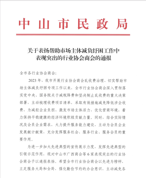 2023年11月10日,中山市民政局发出通报,对在助企减负纾困工作中表现突出的6家协会商会予以表扬,伟德官网电脑版名列其中。