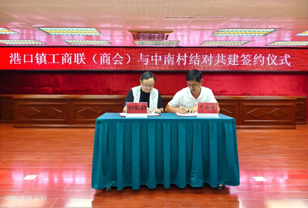 港口镇工商联主席沈洋介绍了港口镇工商联在组织会员企业参与乡村振兴、产业对接、农房风貌管控、社会治理方面的经验及做法,并代表港口镇工商联(商会)与中南村现场举行结对共建签约仪式。