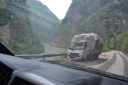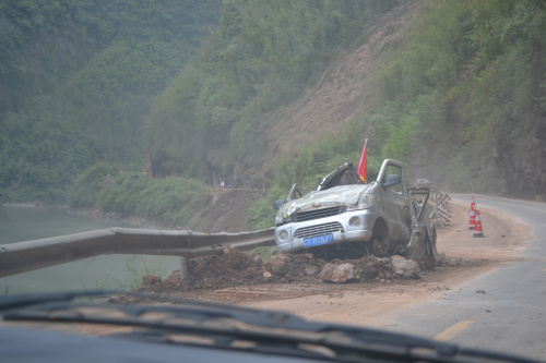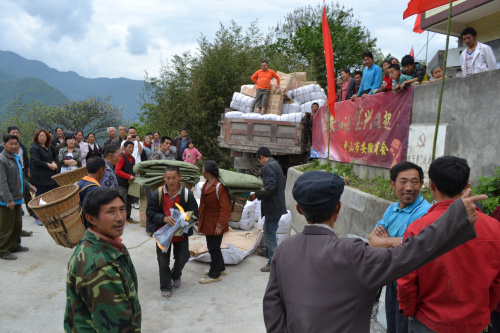 5月4日7:00,我们一行乘坐新徽教育集团的商务车和拉着商会捐赠救灾物资的货车一起向宝兴进发,一路上看到芦山县和宝兴县因地震造成绝大多数房屋垮塌、墙体破裂,特别是省道210线芦山至宝兴段,道路弯急,峡谷幽深,“4·20”芦山强烈地震后,沿途山体飞石不断,虽有大量路政人员一路警戒、清理,还是有6、7部车被塌方砸得面目全非的情景,大家百感交集。10:00,经过3个小时走了80多公里,终于到了宝兴县城,到宝兴县民政局报到后,就根据民政局的安排又驱车到五龙乡战斗村。据了解,战斗村共有5个村民小组共240户880人,全部居住在海拔2-3千米的碓窝山上,以种植中药、经济林为主,虽然在本次地震中未有出现伤亡情况,但房屋和基础设施都有不同程度的损毁。战斗村唯一和外界联系的盘山村道狭窄、险峻,仅能容一台车勉强通过,一边是山,一边就是悬崖,我们的车走了半个多小时到达战斗二组的村民活动室时,新徽的庄司机已是一身的冷汗,半天才缓过神来。在给战斗村每个村民发放一床棉被、每户一套雨衣、雨靴后,我们来到了五龙乡政府,将剩余的120床棉被和60套雨衣、雨靴交给他们统筹安排,然后就在乡政府用开水泡了从雅安带来的方便面和茶叶蛋做午餐,吃完已是14:00,19:00驱车回到成都。5月5日杨进东回到中山。