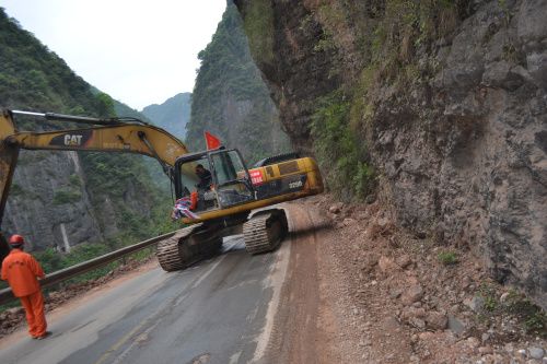 图 省道210芦山-宝兴路段,路政人员随时清理塌方
