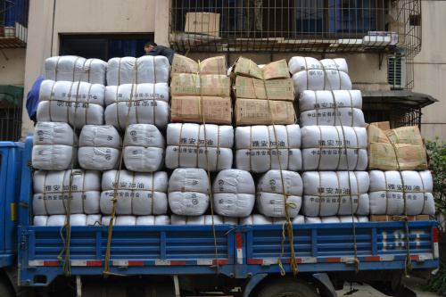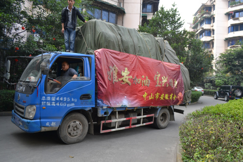5月3日,杨进东和新徽教育集团罗校长等一行5人提货并根据雅安是雨城的特点又购买了300套军用雨衣和雨靴,装车后直奔雅安而去,到达雅安后,已是下午1:30,因芦山到宝兴道路实行7:00-14:00芦山-宝兴,14:00-19:00宝兴-芦山单边放行,我们一行在雅安住宿一夜。