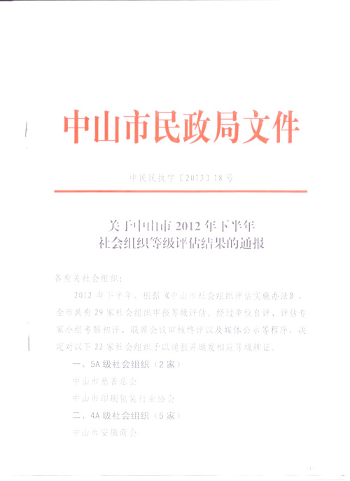 日前,中山市民政局发出《关于中山市2012年下半年社会组织等级结果的通报》的文件,对中山市慈善总会等22家社会组织予以通报并颁发相应等级牌证,伟德官网电脑版被评为中山市异地商会中唯一的一家“4A级社会组织”。