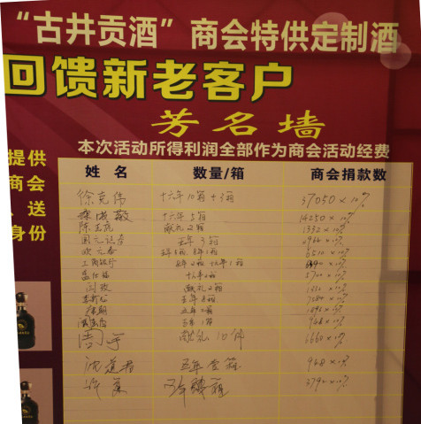 春茗晚宴上,商会秘书处特意制作了2014-2015年购买商会定制酒芳名墙,向大家展示,以感谢这些热心的企业家们购买商会定制酒,秘书处与安徽名酒古井贡酒酒厂合作以低于市场价格卖与企业家们,所获微利用于商会的建设及慈善活动,徐克伟会长及常务们带头乐购,获得企业家们的纷纷响应,名单持续更新中,感谢大家的关爱与支持!