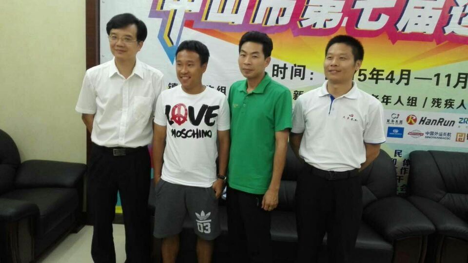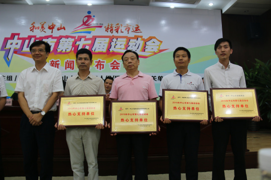 2015年8月21日,中山市第七届运动会新闻发布会,在中山市教育局举办,我商会常务副会长蒋富裕、秘书长孙长征出席此次新闻发布会并接受组委会颁发的“热心支持单位”牌匾。