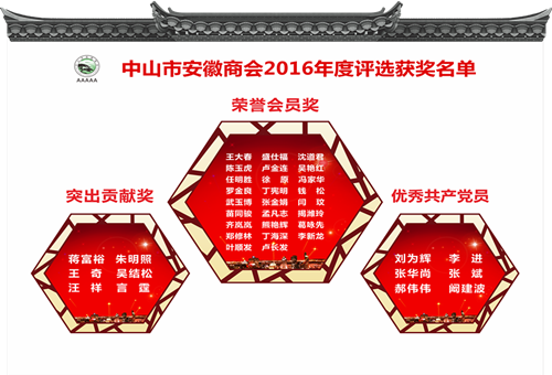2016年,是安徽商会的成果年。商会广大会员为商会的发展作出了积极的贡献,显现出很多先进个人。为了表彰他们对商会的付出,安徽商会授予“突出贡献奖”6名、“荣誉会员奖”26名、“优秀共产党员”6名,以及颁发“战略合作单位”牌匾。