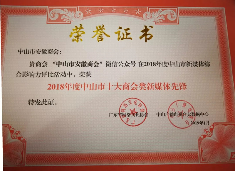 在桑成敬会长的带领下,经过所有会员的共同努力,中山安徽商会荣获中山市“2018中山十大商会新媒体先锋”奖。感谢商会会员企业家们,以及关注商会的乡友、社会同仁:
