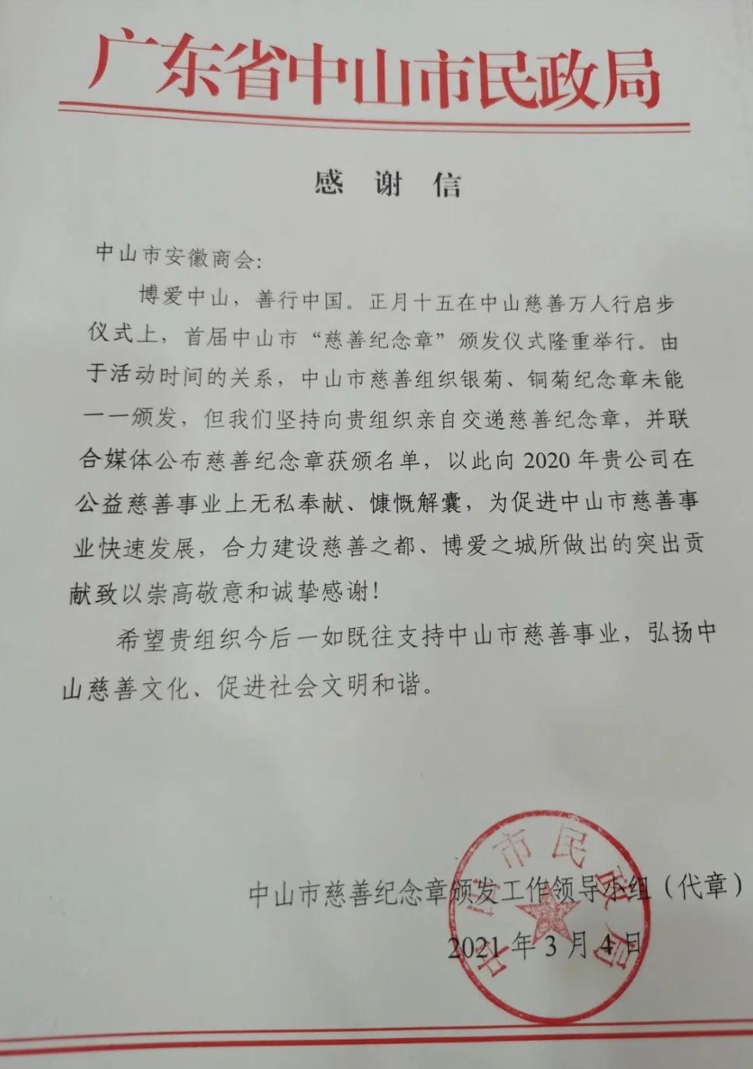 恭喜我会荣获“中山市慈善捐赠企业(组织)铜菊纪念章”殊荣