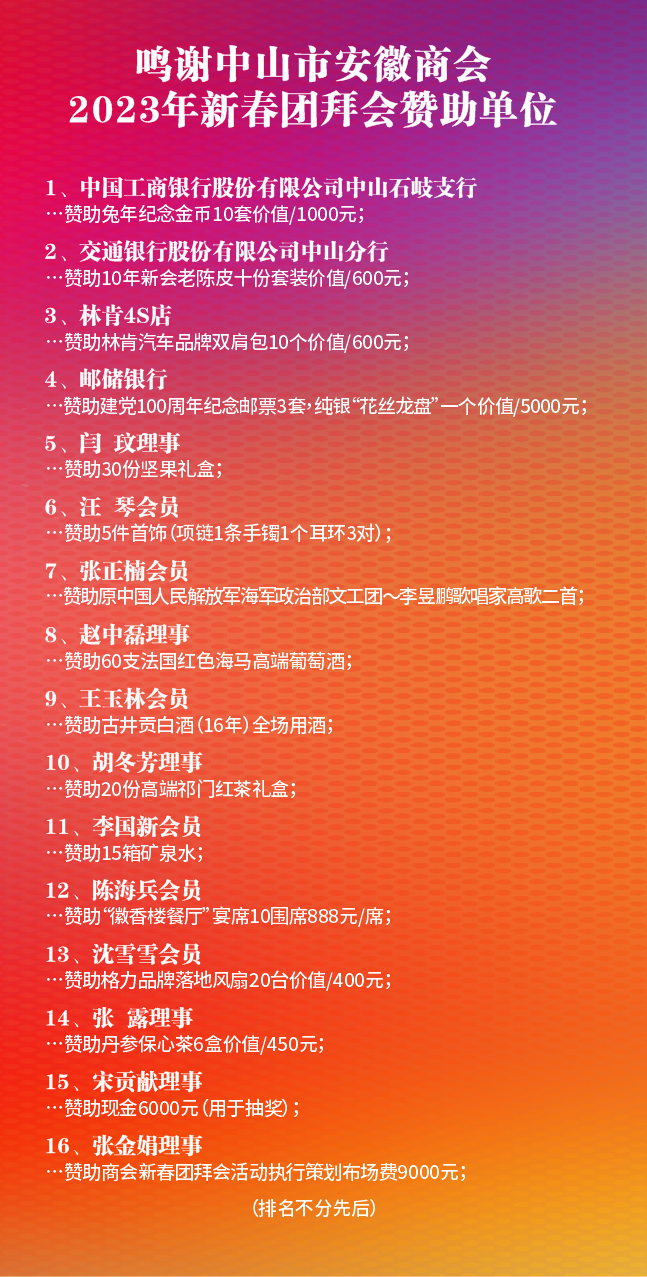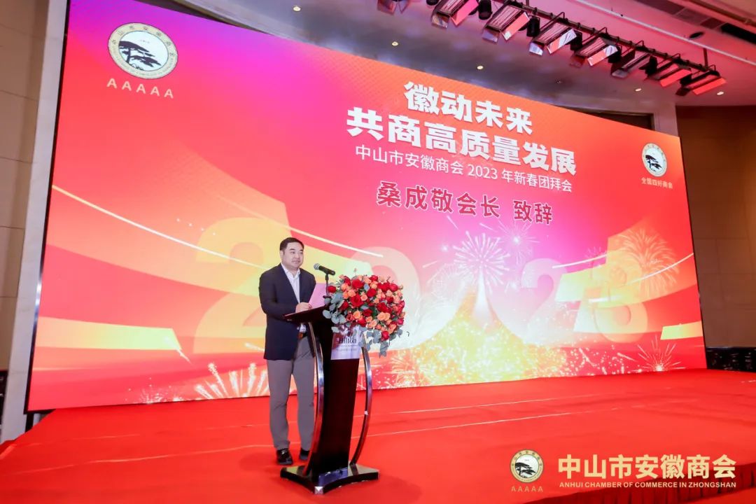 一元复始山河美,万象更新锦绣春!2023年2月18日下午,伟德官网电脑版主题为徽动未来·共商高质量发展2023年新春团拜会在中山市希尔顿酒店成功举办。伟德官网电脑版会长桑成敬、创会会长徐克伟,执行会长虞上海,常务副会长蒋富裕、张华尚、汪辉、汪祥、李进、马靖、许勇、郑修林、张艳振,名誉副会长:柏荣奇、王东红、王伍林、王鹏,监事长罗金良;工商银行中山分行副行长李令言、工商银行孙文支行行长梁智欣、交通银行华桂支行行长刘睿、邮储银行中山分行副总经理陈若玲、林肯中山4S店总经理张涛、原中国人民解放军海军政治部文工团歌唱家(现深圳盛世瑞成生物科技有限公司副总裁)李昱鹏以及全体会员等领导嘉宾200多人出席参加新春团拜会。监事长罗金良、理事:葛咏先、揭潍玲主持了此次新春团拜会活动。