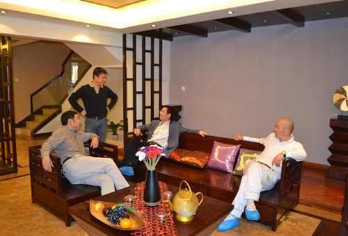下午五点,上午就去打高尔夫球的会员在徐克伟会长的带领下和泡温泉的会员及家属会合后一起来到了商会副会长王奇所开发的龙山御景别墅区参观。龙山御景荣踞中山三乡温泉旅游度假区内,坐拥温泉、山林、高尔夫等多项旅游休闲资源的纯别墅项目,本次龙山御景共开放300㎡、365㎡两套带豪华装修的样板房,户型格局为四房两厅和五房两厅两种。其中300㎡样板房带有浓郁的东南亚风格,奢华大气,格调别具风韵。365㎡样板房则是传统的中式风格,古朴典雅,国画、旗袍、木质边框,根雕等东方元素随处可见。并拥有亲水园林,户户推窗见景,实为喧嚣都市中难以企及的世外桃源,将现代贵族体验和东方大宅院文化完美结合在一起。据龙山御景项目营销策划赵经理介绍,龙山御景是中山为数不多的纯别墅项目,位于泛五桂山温泉豪宅圈,毗邻中山温泉、温泉高尔夫球会、巨龙古玩城等响誉珠三角的旅游度假圣地,是珠三角高端群体度假及自住的品质之选。项目自去年开盘以来,客户来自珠三角各地,尤其以珠海、港澳、广州、深圳等地客户居多,甚至受到广大北方客户的关注。如今借样板间正式开放之机,诚意回馈买家,推出本年度最大优惠额度,买别墅送价值15万的奔驰馈赠券。多名会员带领全家参观后,心动变成行动,达成了意向性协议。