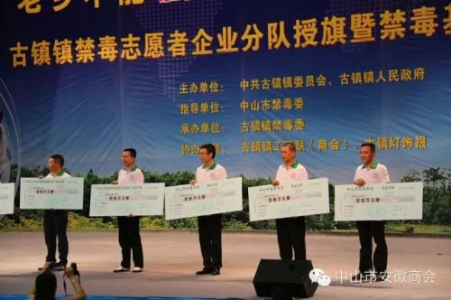 随后,古镇商协会20名代表上台签署禁毒协议,并代表商会为古镇镇禁毒基金捐赠了爱心基金,同时,中山市人民政府副市长、市禁毒委主任、市公安局局长谭培安等领导为商会代表授予企业禁毒分队旗帜和禁毒爱心捐赠奖牌。